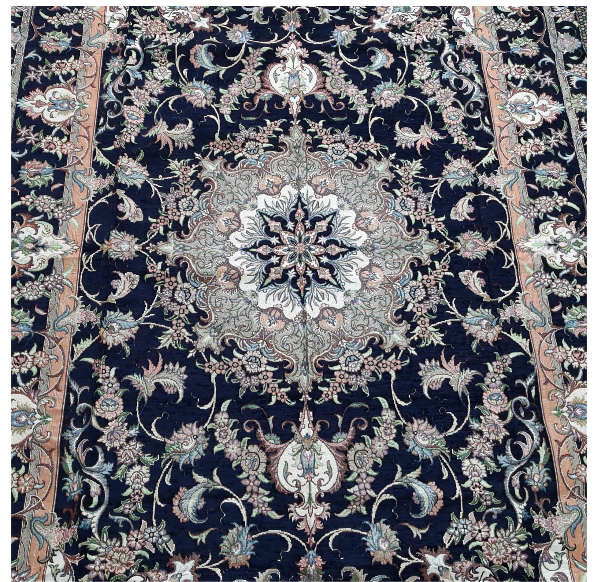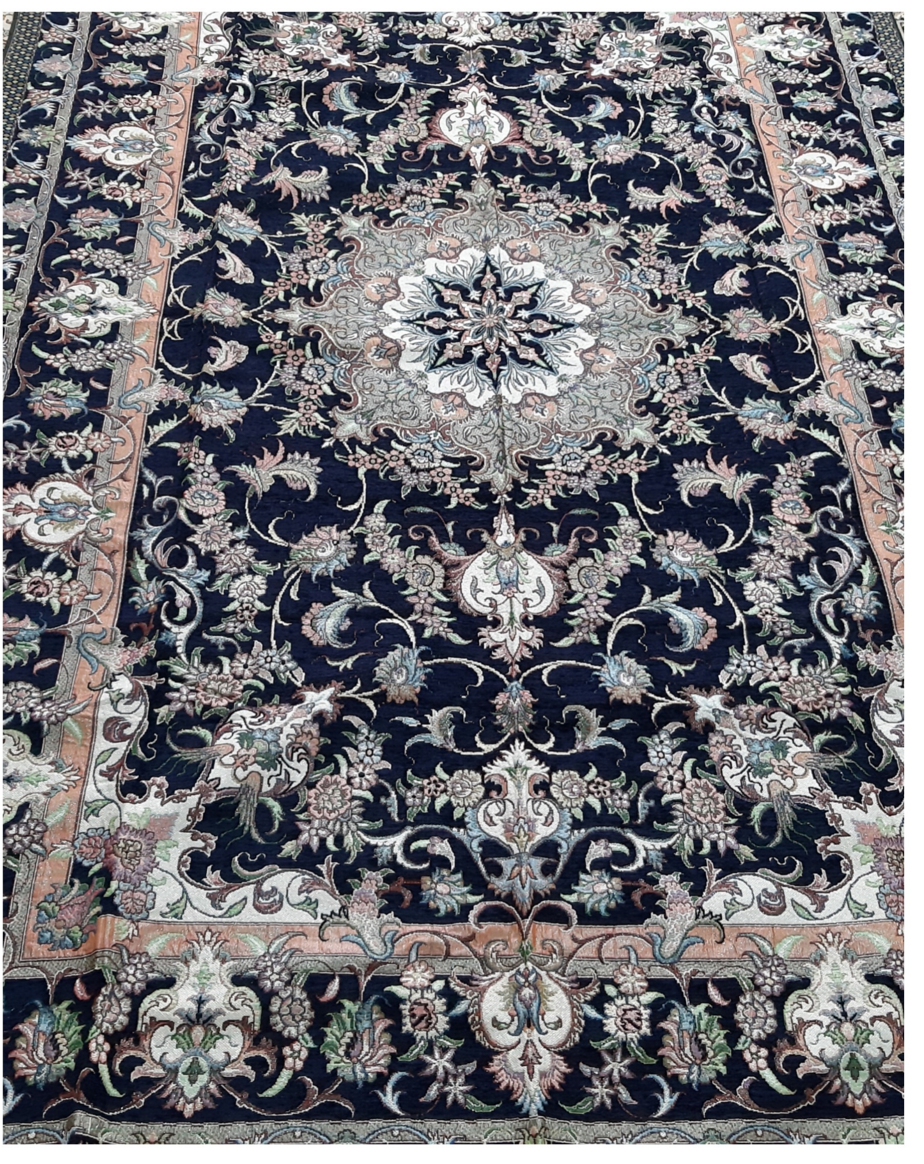 روفرشی ۶متری با سایز تقریبی ۲متر در ۳متر ضخیم و کیفیت عالی زرک دار که در تصویر مشخص نیست زیبا با طرح سنتی رنگ روفرشی با زمینه سرمه ایی